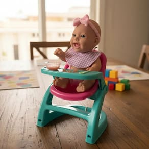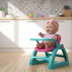 A Boneca Mini Baby Babilina Papinha é a companheira perfeita para os momentos de brincadeira. Com a boneca sentada no cadeirão possui 26 cm de altura, ela é articulada, permitindo que as crianças brinquem com liberdade e criem suas próprias histórias. Feita de 100% vinil, a boneca é segura e durável, ideal para pequenos a partir de 3 anos.