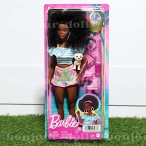 - Barbie A boneca usa uma blusa de babados com ombros de fora com shorts esportivos pastel. Seu cabelo preto encaracolado é utilizado em um lindo afro, e ela tem adoráveis patins rosa nos pés!