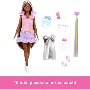 Barbie Boneca e acessórios divertidos e extravagantes, com cabelo preto extralongo e 2 looks, incluindo vestido prateado e extensão de cabelo