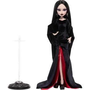 - Boneca colecionável Morticia Addams da série Monster High x Wednesday, com design gótico requintado.