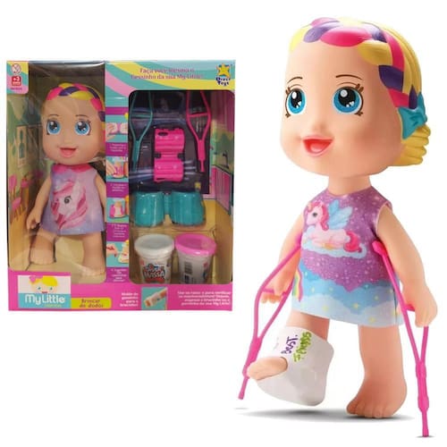 Contém:01 un - Boneca My Little Collection Brincar de Dodói02 un - Moldes02 un - Potinhos de massinha01 un - Par de muletasChegou a boneca My little Collection Brincar de dodói, faça você mesmo o gessinho da sua bonecaUse os raios-x para verificar os machucadinhos Depois engesse o bracinho ou a perninha da sua my little Você pode escrever ou desenhar mensagens fofas em seu gesso para anima-la. Ela possui o cabelo colorido Pintura , e vestido de unicórnio com bastante brilhoComposição:Vinil, tecidos e termoplásticos.Tamanho aproximada da boneca:Altura: 24 cm.Largura: 11 cm.Tamanho aproximado embalagem: AxLxC 29 x 26 x 12cmSelo de Segurança: 003519/2022INMETRO.Atenção: Recomendável para crianças acima de 3 anos.Imagens meramente ilustrativas.