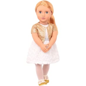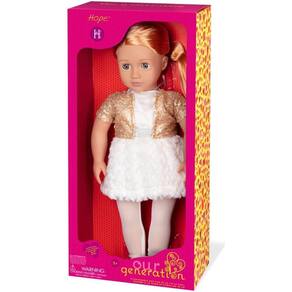 A Hope está sempre pronta para comemorar com os amigos e família! Ela é cheia de brilho e amor. Vem vestida com a sua melhor roupa de festa, pronta para celebrar. Ela veste um lindo vestido branco com uma saia de pele sintética. Usa um casaco de lantejoulas douradas e completa seu look com meia-calça branca e sapatos sociais com detalhes em dourado. Hope é uma linda boneca com longos cabelos loiro-avermelhados e olhos cinza únicos. Seu pescoço, ombros e quadris giram para que ela possa se mover de muitas maneiras diferentes! Hope está pronta para fazer uma nova amiga! Our Generation não se trata apenas de uma boneca, um lindo conjunto de roupas ou mesmo um kit de acessórios fantásticos. É sobre incentivar crianças de todos os estilos e gostos a criar suas próprias histórias, desenvolvendo um universo ilimitado de brincadeiras com bonecas e acessórios. Sua embalagem é feita de material reciclado, especialmente desenvolvida para uma geração mais ecológica que não aceitaria nada menos. Essa é a nossa história, e essa é a nossa turma! Inclui: boneca, bolerinho dourado, vestido branco, meia-calça, sapatos.