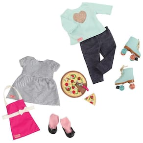 A boneca Isa vem com dois looks completos. Um deles é um traje de garçonete, composto por um vestido listrado preto e branco, avental, sapatos e uma bandeja de pizza para servir aos convidados. Já o outro look é uma camiseta turquesa de manga comprida com estampa de coração brilhante, legging jeans azul e patins turquesa.