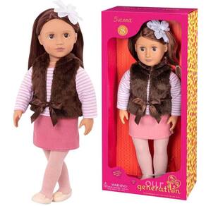 Sienna está pronta para embarcar em um dia muito divertido Ela ama moda, principalmente o seu coletinho fofo em pele sintetica. Adora ir ao shopping com a sua mãe e amigos para ver qual é a próxima grande tendência e o que é elegante Seu cabelo é sedoso, macio e fácil de pentear. Ela tem cabelos castanhos compridos e lisos e lindos olhos castanhos. Vestida com uma camiseta listrada, colete quentinho, saia de veludo rosa, meia calça e sapatos. Suas roupas tem fechos fáceis de abrir o que as tornam rápidas e fáceis de colocar e remover.