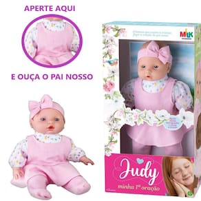 Este é um presente para toda vida, você vai descobrir que a oração pode gerar grande harmonia para toda família, e quando você apertar a barriguinha da boneca, ela vai rezar o Pai Nosso! As meninas vão adorar essa linda boneca! A boneca Judy possui corpinho macio em fibra, as mãozinhas e os pezinhos são com dobrinhas igual a de um bebezinho. As crianças vão adorar!