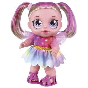 a boneca produzida em vinil macio e articulado possui 27cm de altura, visual super divertido composto por um lindo vestido colorido, grandes olhos cintilantes e cabelo loiro com mechas rosa. Acompanha acessórios surpresa, sendo eles: sapato, mascote e tiara