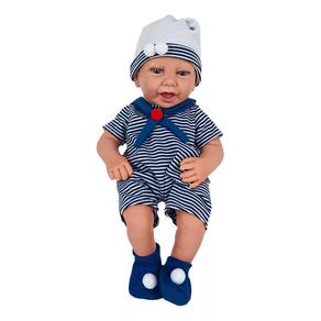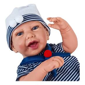 - Este lindo menininho com roupa de Marinheiro já vem com carteirinha de vacinação e certidão de nascimento. - Ele possui 42cm de altura e já acompanha um charmoso macacão e touquinha.