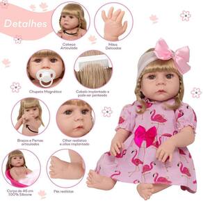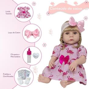 Conteúdo: 1 Bebê Reborn Cabeça, Membros e Corpo de Vinil 1 Vestido 1 Par de Cílios 1 Par de Brincos 1 Chupeta 1 Mamadeira Simples 5 Certificados 2 Fraldas 1 Laço Cetim