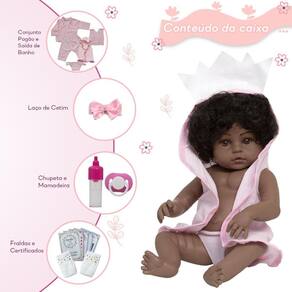 Conteúdo: 1 Bebê Reborn Cabeça, Membros e Corpo de Vinil 1 Conjunto Pagão com Saída de Banho 1 Par de Cílios 1 Par de Brincos 1 Chupeta 1 Mamadeira Simples 5 Certificados 2 Fraldas 1 Laço Cetim