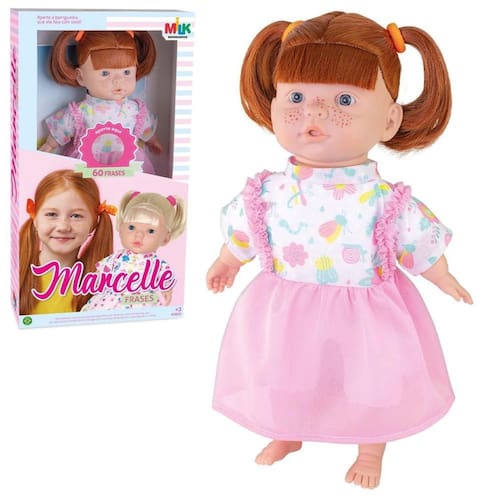 Boneca Marcelle 60 Frases Ruiva Milk Brinquedos    A Boneca Marcelle Frases Ruiva é perfeita para proporcionar momentos de interação e diversão para as crianças. Com 38cm de altura, esta boneca encantadora fala 60 frases, promovendo um vínculo emocional e estimulando o aprendizado de forma lúdica.   Feita com tecido macio, a Boneca Marcelle é agradável ao toque e proporciona conforto ao brincar. Suas frases são variadas e interagem com a criança, incentivando o desenvolvimento da comunicação, da empatia e da criatividade. Ideal para momentos de brincadeira, aprendizado e afeto, a boneca ajuda no desenvolvimento emocional e social das crianças.   Com um mecanismo de fácil utilização, basta apertar o botão para que a boneca comece a falar suas frases divertidas e educativas, tornando a brincadeira ainda mais envolvente. A Boneca Marcelle Ruiva é a companheira ideal para estimular o desenvolvimento cognitivo e emocional das pequenas.   Especificações:  - Fabricante: Milk - Referência: 676 - Medidas Aproximadas da Boneca: 38CM - Composição: Enchimento de fibra, tecido e vinil - Idade Recomendada: +3 Anos - Utiliza 3 baterias lithium AG13/LR44 1,5V - EAN: 7898283856765 - Registro 001524/2019 OCP 0006 - Compulsório INMETRO   Contém: - 1 Boneca Marcelle Ruiva