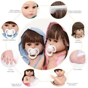 A nossa empresa tem a missão de garantir a total satisfação de seus clientes, onde a qualidade e o atendimento excepcional são nossa prioridade Estamos muito felizes em apresentar os Bonecos Bebê Reborn Gêmeos para você, um produto cuidadosamente selecionado para atender às suas necessidades. Compre agora e experimente a diferença em comprar com a nossa loja.Os Bonecos Bebê Reborn Gêmeos são o sonho das meninas Produzida 100% em vinil siliconado, essas bonecas podem sentar, deitar e fazer tudo que a sua imaginação deixar. Com seus olhos castanhos e detalhes realistas elas são encantadoras e apaixonantes. Sua criança merece a melhor qualidade de bebê reborn Marca: Cegonha Reborn DollsModelo: Bonecos Bebê Reborn GêmeosCor: BegeMaterial: Vinil Siliconado AtóxicoCaracterísticas Principais: Membros Articulados, Corpo de Silicone, Detalhes Realistas.Medidas Aprox.: Altura da Boneca: 46cm Peso Aprox. Da Boneca: 0,745 Kg Certificado INMETRO Recomendado para crianças maiores de 03 anosConteúdo:Menina1 Bebê Reborn Cabeça, Membros e Corpo de Vinil 1 Conjunto Saída de Banho1 Par de Cílios1 Par de Brinco1 Chupeta1 Mamadeira Simples5 Certificados2 Fraldas1 Laço CetimMenino1 Bebê Reborn Cabeça, Membros e Corpo de Vinil 1 Conjunto Saída de Banho1 Par de Cílios1 Chupeta1 Mamadeira Simples5 Certificados2 FraldasGarantia30 dias de garantia oferecida pelo fabricante.Dúvidas Frequentes:1. Elas acompanham ItensR. Sim, todos os itens da descrição.2. Elas emitem algum somR. Não, elas não emitem nenhum som.3. Pode dar banho na bonecaR. Sim, pois o material do corpo é de Silicone.4. Pode escolher a cor dos olhos da bonecaR. Não, os olhos já vêm de fábrica.Tags: Reborn, Realista, Menina, Infantil, Silicone, Princesa, Linda, Morena, Loira, Fofa, Banho, Enxoval, Completo, Grande, Baby Alive.Homologação Inmetro: IP-BRI-0406/2022-07