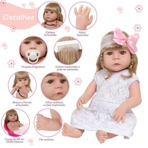 Conteúdo: 1 Bebê Reborn Cabeça, Membros e Corpo de Vinil 1 Vestido 1 Par de Cílios 1 Par de Brincos 1 Chupeta 1 Mamadeira Simples 5 Certificados 2 Fraldas 1 Laço Cetim