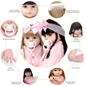 Conteúdo: 2 Bebê Reborn Cabeça, Membros e Corpo de Vinil 2 Conjunto de Roupa Pagão Rosa 2 Par de Cílios 2 Par de Brinco 2 Chupeta 2 Mamadeira Simples 10 Certificados 6 Fraldas 2 Laço Cetim 4 Presilhinha 2 Par de Luvas 2 Bolsa Maternidade 2 Prendedor de Chupeta 2 Kit Pente e Escova Simples