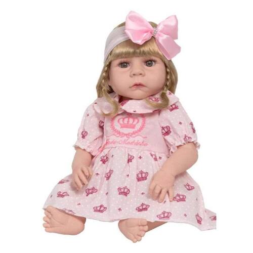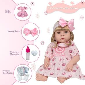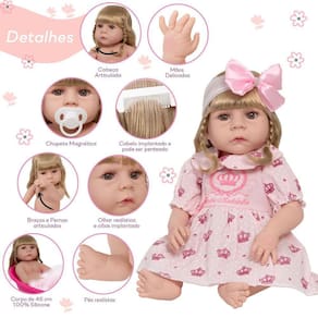 Conteúdo: 1 Bebê Reborn Cabeça, Membros e Corpo de Vinil 1 Vestido 1 Par de Cílios 1 Par de Brincos 1 Chupeta 1 Mamadeira Simples 5 Certificados 2 Fraldas 1 Laço Cetim