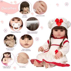A Boneca Bebê Reborn é o sonho das crianças Produzida 100% em vinil siliconado, essa boneca pode sentar, deitar e fazer tudo que a sua imaginação deixar. Com seus olhos castanhos e detalhes realistas ela é encantadora e apaixonante. Sua criança merece a melhor qualidade de bebê reborn