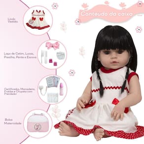 A nossa empresa tem a missão de garantir a total satisfação de seus clientes, onde a qualidade e o atendimento excepcional são nossa prioridade Estamos muito felizes em apresentar a Boneca Bebê Reborn para você, um item cuidadosamente selecionado para atender às suas necessidades. Compre agora e experimente a diferença em comprar com a nossa loja.A Boneca Bebê Reborn é o sonho das crianças Produzida 100% em vinil siliconado, essa boneca pode sentar, deitar e fazer tudo que a sua imaginação deixar. Com seus olhos castanhos e detalhes realistas ela é encantadora e apaixonante. Sua criança merece a melhor qualidade de bebê reborn Marca: Cegonha Reborn DollsModelo: Boneca Bebê Reborn Cor: BegeMaterial: Vinil Siliconado AtóxicoCaracterísticas Principais: Membros Articulados, Corpo de Silicone, Detalhes Realistas.Medidas Aprox.: Altura da Boneca: 46cm Peso Aprox. Da Boneca: 0,745 Kg Certificado INMETRO Recomendado para crianças maiores de 03 anosConteúdo:1 Bebê Reborn Cabeça, Membros e Corpo de Vinil 1 Vestido1 Par de Cílios1 Par de Brinco1 Chupeta 1 Mamadeira Simples5 Certificados3 Fraldas1 Laço Cetim2 Presilhinha1 Par de Luvas1 Bolsa Maternidade1 Prendedor de ChupetaKit Pente e Escova SimplesGarantia30 dias de garantia oferecida pelo fabricante.Dúvidas Frequentes:1. Ela acompanha ItensR. Sim, todos os itens da descrição.2. Ela emite algum somR. Não, ela não emite nenhum som.3. Pode dar banho na bonecaR. Sim, pois o material do corpo é de Silicone.4. Pode escolher a cor dos olhos da bonecaR. Não, os olhos já vêm de fábrica.Tags: Realista, Menina, Infantil, Silicone, Princesa, Linda, Morena, Loira, Fofa, Banho, Enxoval, Completo, Grande, Baby Alive.Homologação Inmetro: IP-BRI-0406/2022-07