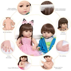 Bonecos Bebê Reborn Gêmeos são o sonho das meninas Produzidos 100% em vinil siliconado, esses bonecos podem sentar, deitar e fazer tudo que a sua imaginação deixar. Com seus lindos olhos e detalhes realistas eles são encantadores e apaixonantes. Sua criança merece a melhor qualidade de bebê reborn
