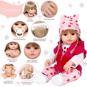 A Boneca Bebê Reborn Girafinha é o sonho das meninas Produzida 100% em vinil siliconado, essa boneca pode sentar, deitar e fazer tudo que a sua imaginação deixar. Com seus olhos castanhos e detalhes realistas ela é encantadora e apaixonante. Sua criança merece a melhor qualidade de bebê reborn
