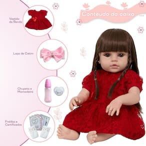 A Boneca Bebê Reborn é o sonho das crianças Produzida 100% em vinil siliconado, essa boneca pode sentar, deitar e fazer tudo que a sua imaginação deixar. Com seus olhos castanhos e detalhes realistas ela é encantadora e apaixonante. Sua criança merece a melhor qualidade de bebê reborn
