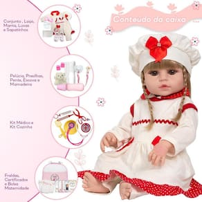 A Boneca Bebê Reborn é o sonho das crianças Produzida 100% em vinil siliconado, essa boneca pode sentar, deitar e fazer tudo que a sua imaginação deixar. Com seus olhos castanhos e detalhes realistas ela é encantadora e apaixonante. Sua criança merece a melhor qualidade de bebê reborn
