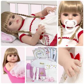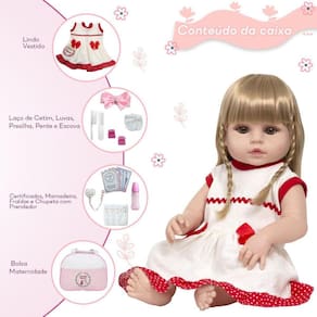 A nossa empresa tem a missão de garantir a total satisfação de seus clientes, onde a qualidade e o atendimento excepcional são nossa prioridade Estamos muito felizes em apresentar a Boneca Bebê Reborn para você, um item cuidadosamente selecionado para atender às suas necessidades. Compre agora e experimente a diferença em comprar com a nossa loja.A Boneca Bebê Reborn é o sonho das crianças Produzida 100% em vinil siliconado, essa boneca pode sentar, deitar e fazer tudo que a sua imaginação deixar. Com seus olhos castanhos e detalhes realistas ela é encantadora e apaixonante. Sua criança merece a melhor qualidade de bebê reborn Marca: Cegonha Reborn DollsModelo: Boneca Bebê Reborn Cor: BegeMaterial: Vinil Siliconado AtóxicoCaracterísticas Principais: Membros Articulados, Corpo de Silicone, Detalhes Realistas.Medidas Aprox.: Altura da Boneca: 46cm Peso Aprox. Da Boneca: 0,745 Kg Certificado INMETRO Recomendado para crianças maiores de 03 anosConteúdo:1 Bebê Reborn Cabeça, Membros e Corpo de Vinil 1 Vestido1 Par de Cílios1 Par de Brinco1 Chupeta 1 Mamadeira Simples5 Certificados3 Fraldas1 Laço Cetim2 Presilhinha1 Par de Luvas1 Bolsa Maternidade1 Prendedor de ChupetaKit Pente e Escova SimplesGarantia30 dias de garantia oferecida pelo fabricante.Dúvidas Frequentes:1. Ela acompanha ItensR. Sim, todos os itens da descrição.2. Ela emite algum somR. Não, ela não emite nenhum som.3. Pode dar banho na bonecaR. Sim, pois o material do corpo é de Silicone.4. Pode escolher a cor dos olhos da bonecaR. Não, os olhos já vêm de fábrica.Tags: Realista, Menina, Infantil, Silicone, Princesa, Linda, Morena, Loira, Fofa, Banho, Enxoval, Completo, Grande, Baby Alive.Homologação Inmetro: IP-BRI-0261/2022-05
