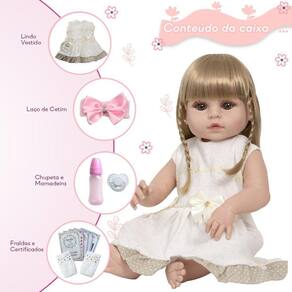 A Boneca Bebê Reborn é o sonho das crianças Produzida 100% em vinil siliconado, essa boneca pode sentar, deitar e fazer tudo que a sua imaginação deixar. Com seus olhos castanhos e detalhes realistas ela é encantadora e apaixonante. Sua criança merece a melhor qualidade de bebê reborn