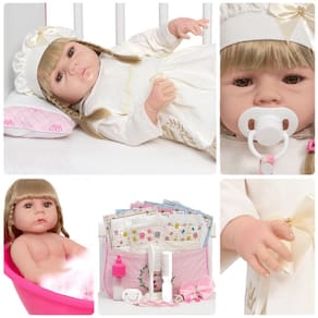 Conteúdo: 1 Bebê Reborn Cabeça, Membros e Corpo de Vinil 1 Conjunto de Roupa Luxo 1 Par de Cílios 1 Par de Brincos 1 Chupeta 1 Mamadeira Simples 5 Certificados 3 Fraldas 1 Laço Cetim 2 Presilhinha 1 Par de Luvas 1 Bolsa Maternidade 1 Prendedor de Chupeta Kit Pente e Escova Simples