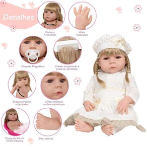 A Boneca Bebê Reborn é o sonho das crianças Produzida 100% em vinil siliconado, essa boneca pode sentar, deitar e fazer tudo que a sua imaginação deixar. Com seus olhos castanhos e detalhes realistas ela é encantadora e apaixonante. Sua criança merece a melhor qualidade de bebê reborn