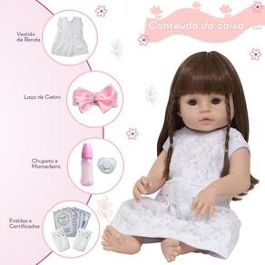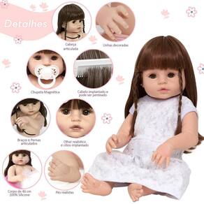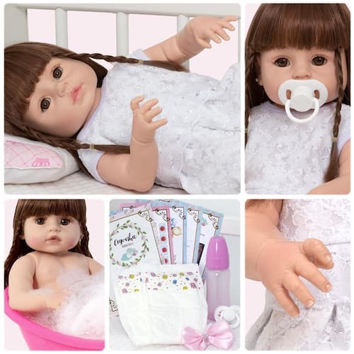 A Boneca Bebê Reborn é o sonho das crianças Produzida 100% em vinil siliconado, essa boneca pode sentar, deitar e fazer tudo que a sua imaginação deixar. Com seus olhos castanhos e detalhes realistas ela é encantadora e apaixonante. Sua criança merece a melhor qualidade de bebê reborn