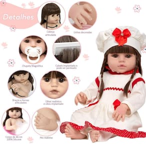 A Boneca Bebê Reborn é o sonho das crianças Produzida 100% em vinil siliconado, essa boneca pode sentar, deitar e fazer tudo que a sua imaginação deixar. Com seus olhos castanhos e detalhes realistas ela é encantadora e apaixonante. Sua criança merece a melhor qualidade de bebê reborn