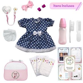 A Boneca Bebê Reborn é o sonho das meninas Produzida 100% em vinil siliconado, essa boneca pode sentar, deitar e fazer tudo que a sua imaginação deixar. Com seus olhos castanhos e detalhes realistas ela é encantadora e apaixonante. Sua criança merece a melhor qualidade de bebê reborn