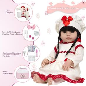 A Boneca Bebê Reborn é o sonho das crianças Produzida 100% em vinil siliconado, essa boneca pode sentar, deitar e fazer tudo que a sua imaginação deixar. Com seus olhos castanhos e detalhes realistas ela é encantadora e apaixonante. Sua criança merece a melhor qualidade de bebê reborn