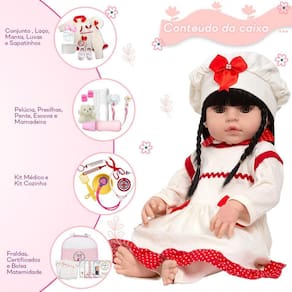 A nossa empresa tem a missão de garantir a total satisfação de seus clientes, onde a qualidade e o atendimento excepcional são nossa prioridade Estamos muito felizes em apresentar a Boneca Bebê Reborn para você, um item cuidadosamente selecionado para atender às suas necessidades. Compre agora e experimente a diferença em comprar com a nossa loja.A Boneca Bebê Reborn é o sonho das crianças Produzida 100% em vinil siliconado, essa boneca pode sentar, deitar e fazer tudo que a sua imaginação deixar. Com seus olhos castanhos e detalhes realistas ela é encantadora e apaixonante. Sua criança merece a melhor qualidade de bebê reborn Marca: Cegonha Reborn DollsModelo: Boneca Bebê Reborn Cor: BegeMaterial: Vinil Siliconado AtóxicoCaracterísticas Principais: Membros Articulados, Corpo de Silicone, Detalhes Realistas.Medidas Aprox.: Altura da Boneca: 46cm Peso Aprox. Da Boneca: 0,745 Kg Certificado INMETRO Recomendado para crianças maiores de 03 anosConteúdo:1 Bebê Reborn Cabeça, Membros e Corpo de Vinil 1 Conjunto Roupa Luxo1 Par de Cílios1 Par de Brinco1 Chupeta com Artesanato1 Mamadeira Luxo5 Certificados3 Fraldas1 Laço Cetim2 Presilhinha1 Par de Luvas1 Bolsa Maternidade1 Prendedor de ChupetaKit Pente e Escova com Artesanato1 Kit medico1 Sapatinho c Laço1 Kit Panelinha 1 UrsinhoGarantia30 dias de garantia oferecida pelo fabricante.Dúvidas Frequentes:1. Ela acompanha ItensR. Sim, todos os itens da descrição.2. Ela emite algum somR. Não, ela não emite nenhum som.3. Pode dar banho na bonecaR. Sim, pois o material do corpo é de Silicone.4. Pode escolher a cor dos olhos da bonecaR. Não, os olhos já vêm de fábrica.Tags: Realista, Menina, Infantil, Silicone, Princesa, Linda, Morena, Loira, Fofa, Banho, Enxoval, Completo, Grande, Baby Alive.Homologação Inmetro: CE-BRI/ICEPEX-N 01262-14-6