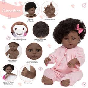 Conteúdo: 1 Bebê Reborn Cabeça, Membros e Corpo de Vinil 1 Conjunto Pagão com Saída de Banho 1 Par de Cílios 1 Par de Brincos 1 Chupeta 1 Mamadeira Simples 5 Certificados 3 Fraldas 1 Laço Cetim 1 Pulseira 2 Presilhinha 1 Par de Luvas 1 Bolsa Maternidade 1 Prendedor de Chupeta Kit Pente e Escova Simples