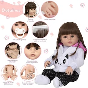 A Boneca Bebê Reborn Pandinha é o sonho das meninas Produzida 100% em vinil siliconado, essa boneca pode sentar, deitar e fazer tudo que a sua imaginação deixar. Com seus olhos castanhos e detalhes realistas ela é encantadora e apaixonante. Sua criança merece a melhor qualidade de bebê reborn