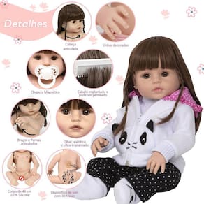 A Boneca Bebê Reborn Pandinha é o sonho das meninas Produzida 100% em vinil siliconado, essa boneca pode sentar, deitar e fazer tudo que a sua imaginação deixar. Com seus olhos castanhos e detalhes realistas ela é encantadora e apaixonante. Sua criança merece a melhor qualidade de bebê reborn