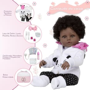 A Boneca Bebê Reborn Pandinha é o sonho das crianças Produzida 100% em vinil siliconado, essa boneca pode sentar, deitar e fazer tudo que a sua imaginação deixar. Com seus olhos castanhos e detalhes realistas ela é encantadora e apaixonante. Sua criança merece a melhor qualidade de bebê reborn