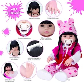 A nossa empresa tem a missão de garantir a total satisfação de seus clientes, onde a qualidade e o atendimento excepcional são nossa prioridade Estamos muito felizes em apresentar a Boneca Bebê Reborn Girafinha para você, um item cuidadosamente selecionado para atender às suas necessidades. Compre agora e experimente a diferença em comprar com a nossa loja.A Boneca Bebê Reborn Girafinha é o sonho das meninas Produzida 100% em vinil siliconado, essa boneca pode sentar, deitar e fazer tudo que a sua imaginação deixar. Com seus olhos castanhos e detalhes realistas ela é encantadora e apaixonante. Sua criança merece a melhor qualidade de bebê reborn Marca: Cegonha Reborn DollsModelo: Boneca Bebê Reborn GirafinhaCor: BegeMaterial: Vinil Siliconado AtóxicoCaracterísticas Principais: Membros Articulados, Corpo de Silicone, Detalhes Realistas.Medidas Aprox.: Altura da Boneca: 52cm Peso Aprox. Da Boneca: 0,745 Kg Certificado INMETRO Recomendado para crianças maiores de 03 anosConteúdo:1 Bebê Reborn Cabeça, Membros e Corpo de Vinil 1 Conjunto de Roupa Girafinha1 Par de Cílios1 Par de Brinco1 Chupeta com Artesanato1 Mamadeira Luxo5 Certificados3 Fraldas1 Laço Cetim2 Presilhinha1 Par de Luvas1 Bolsa Maternidade1 Prendedor de ChupetaKit Pente e Escova com Artesanato1 Kit medico1 Sapatinho c Laço1 Kit Panelinha 1 Par de Sapatinhos1 PelúciaGarantia30 dias de garantia oferecida pelo fabricante.Dúvidas Frequentes:1. Ela acompanha ItensR. Sim, todos os itens da descrição.2. Ela emite algum somR. Não, ela não emite nenhum som.3. Pode dar banho na bonecaR. Sim, pois o material do corpo é de Silicone.4. Pode escolher a cor dos olhos da bonecaR. Não, os olhos já vêm de fábrica.Tags: Boneca, Bebe, Reborn, Realista, Menina, Infantil, Silicone, Bailarina, Princesa, Linda, Morena, Loira, Fofa, Banho, Enxoval, Completo, Grande, Baby Alive.Homologação Inmetro: 0205/21-BQ-01