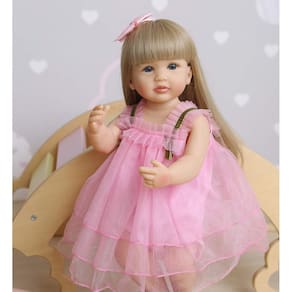 - [MATERIAIS] Esta linda boneca renascida é feita de vinil em corpo inteiro, braços, pernas, cabeça e pés. Bem à prova d'água. O cabelo é uma peruca loira de alta fidelidade com grampo rosa. A boneca infantil é perfeita para a hora do banho.