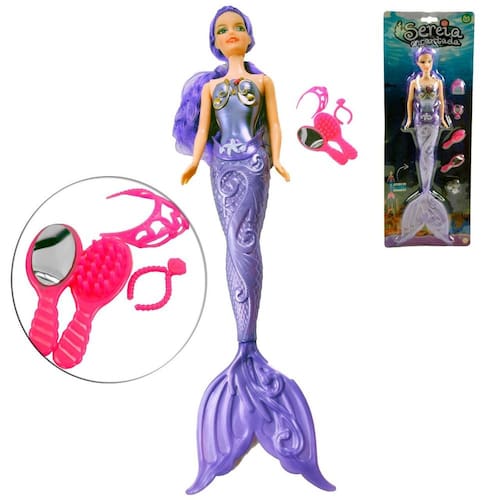 Boneca Sereia com Acessórios LUZ 5 Peças En Boneca Sereia com Acessórios Luz 5 Peças Encantada\nContém 5 Peças.\n(Utiliza 3 Baterias L1154 - Inclusas).\nEspecificações: Marca : ARK\nTipo de material : Plástico\nCores ou Estampa : (Azul Claro, Lilás Ou Rosa)\nDimensões do Produto : 45 X 17 X 2 CM\nDimensões da Embalagem : 45 X 17 X 2 CM\nPeso Bruto (Gramas) : 0.173