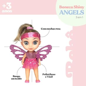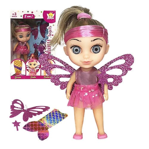 Boneca shiny angels 3 em 1 sereia fada e bailarina Esta boneca versátil é tudo o que uma criança pode sonharseu design foi criado para que possa ter diversas experiências na hora da brincadeira, desde desbravar os mares em sua forma de sereia, se aventurar em mundo mágico em forma de fada e dar um show nos palcos como uma bailarina.A troca é fácil de fazer, bastando apenas encaixar as peças para que a brincadeira mude, contando com uma roupa de bailarina, uma cauda de sereia para encaixar nas pernas, asas e varinha para se transformar em fada, além disso, a boneca é cheia de detalhes, com olhos azuis e cabelos loiros com mechas rosa.Produzida com materiais de qualidade, a boneca possui uma ótima durabilidade, garantindo que possa brincar por horas sem se preocupar com a integridade do brinquedo. a boneca conta com:-01 asas de fada-01 varinha-01 cauda de sereia -não recomendado para menos de 03 anos por conter partes pequenas que podem sem engolidas ou aspiradas. especificações:material: polietileno, vinil e roupa em tecidodimensões: alt.: 20cm x larg.: 8cm peso: aprox. 110g registro inmetro: ce-bri/iqb 4115 nm 300/2002 contém: 01 boneca shiny angels 3 em 1 sereia fada e bailarina