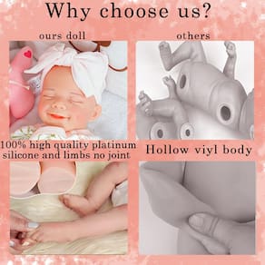 - Processo de produção: a boneca Reborn é feita de 100% silicone. O corpo da boneca é de silicone sólido, que é muito diferente do vinil oco. Nossa boneca de silicone é mais macia e realista, e os membros não têm juntas, então os membros podem ser dobrados e colocados à vontade.