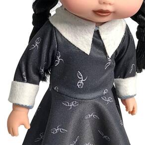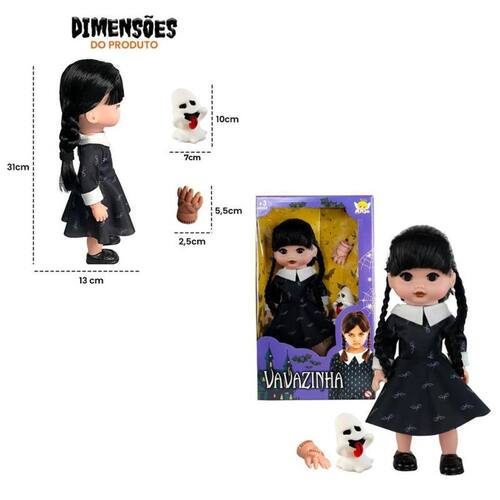 Descrição: A Boneca Vavazinha inspirada na Wandinha é a companheira perfeita para a diversão das crianças que amam a série Com detalhes incríveis, como franjinha, roupinha preta, e acompanhada de sua inseparável amiga Mãozinha e um fantasminha, ela traz toda a magia da personagem para as brincadeiras.