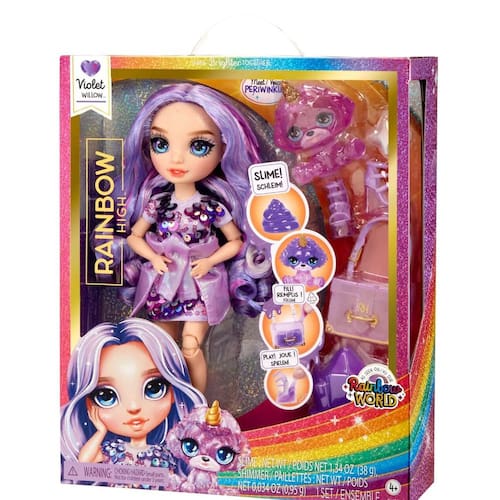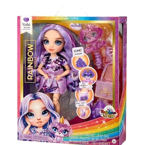 Violet Willow da Rainbow High vem vestida de roxo com muito brilho e estilo. Com cabelos longos e vibrantes, olhos de vidro e rosto iluminado, ela traz acessórios personalizáveis, como sapatos e bolsas personalizáveis, que podem mudar de cor com um toque de slime. Acompanha um bichinho mágico que também muda de cor.