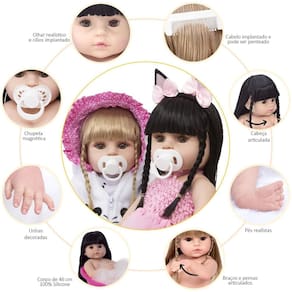 as bonecas bebê reborn gêmeas são o sonho das meninas! produzidas 100% em vinil siliconado atóxico, essas bonecas são encantadoras e apaixonantes. Com seus olhos castanhos e detalhes realistas, elas proporcionam uma experiência única de brincadeira. Sua criança merece a melhor qualidade de bebê reborn. Compre agora e tenha a garantia de total satisfação! a nossa empresa tem como prioridade a qualidade e o atendimento excepcional aos clientes. Estamos muito felizes em apresentar as bonecas bebê reborn gêmeas, um produto cuidadosamente selecionado para atender às suas necessidades. As bonecas bebê reborn gêmeas são confeccionadas pela marca cegonha reborn dolls e possuem membros articulados, corpo de silicone e detalhes realistas. Elas têm aproximadamente 46cm de altura e pesam cerca de 0,745 kg. Além disso, possuem certificado do inmetro, garantindo a segurança das crianças. O conjunto inclui 2 bebê reborn  cabeça, membros e corpo de vinil , 1 conjunto de roupa pandinha, 1 conjunto de roupa coelhinha, 2 pares de cílios, 2 pares de brincos, 2 chupetas, 2 mamadeiras simples, 10 certificados, 6 fraldas, 2 laços de cetim, 4 presilhas, 2 pares de luvas, 2 bolsas maternidade, 2 prendedores de chupeta, 2 kits pente e escova simples, 1 par de sandalinhas e 2 pelúcias  cor  . A boneca bebê reborn é ideal para crianças maiores de 3 anos, proporcionando momentos de diversão e estimulando a criatividade e imaginação das crianças. Elas podem sentar, deitar e fazer tudo o que a imaginação permitir.