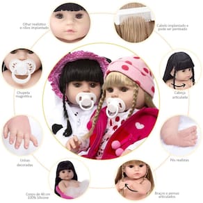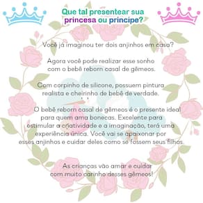 as bonecas bebê reborn gêmeas girafinha loira pandinha morena enxoval são perfeitas para realizar o sonho das meninas! produzidas com materiais de alta qualidade, essas bonecas são encantadoras e apaixonantes. Feitas 100% em vinil siliconado atóxico, as gêmeas girafinha loira pandinha morena enxoval possuem membros articulados e corpo de silicone, proporcionando uma experiência realista e cheia de detalhes encantadores. Com seus olhos castanhos, elas cativam a todos com seu charme e delicadeza. Com altura de 46cm e peso aproximado de 0,745 kg, essas bonecas são perfeitas para crianças maiores de 03 anos. Elas vêm acompanhadas de diversos itens, como um conjunto de roupa girafinha, um conjunto de roupa pandinha, dois pares de cílios, dois pares de brinco, duas chupetas, duas mamadeiras simples, dez certificados, quatro fraldas, um par de sapatinhos e duas pelúcias. A marca responsável por essas bonecas é a cegonha reborn dolls, conhecida pela sua qualidade excepcional. As gêmeas girafinha loira pandinha morena enxoval possuem certificado inmetro, garantindo a segurança e tranquilidade dos pais.
