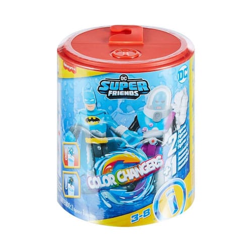 As crianças podem representar histórias de combate ao crime com este conjunto de bonecos Imaginext com personagens DC Super Friends, legal que muda de cor na água.