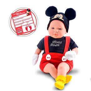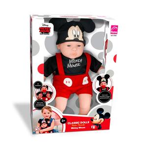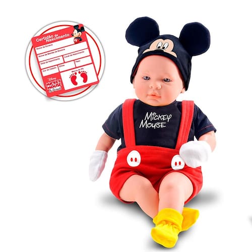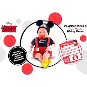 Boneco Bebê - Classic Dolls Disney - Recém Nascido - Mickey - Roma: esse lindo boneco traz a doçura do ratinho mais famoso da Disney. Além da roupa personalizada inspirada no personagem Mickey, o boneco também vem com chupeta e uma certidão de nascimento para registrar o bebê. O Boneco Classic Dolls Mickey Mouse possui membros em vinil e corpo macio preenchido com fibra sintética e algodão. As crianças vão se divertir de montão com a boneco recém-nascido inspirada na Mickey Mouse. INFORMAÇÕES: • Produto: Boneco Classic Dolls Mickey Mouse • Marca: Roma Brinquedos • Coleção: Classic Dolls Recém Nascido • Linha: Disney • Tipo: Boneco bebê com acessórios • Categoria: Bonecos e Cia • Tamanho (C x A x L): 23 x 40.5 x 13 cm • Volume (Peso): 0.580 kg • Conteúdo: Boneco, chupeta e certidão de nascimento • Recomendação: para crianças a partir de 03 anos de idade ESPECIFICAÇÕES: • Referência: 5161 • Código de Barras: 7896965251617 • Embalagem (C x A x L): 29.7 x 42 x 16.2 cm • Embalagem (Peso): 1.010 kg • Material / Composição: - Boneco: membros em vinil e corpo macio em algodão e fibra sintética - Roupinha: Algodão e Poliéster - Acessórios: Plástico • Registro: 03129/2019 • Certificado: Órgãos Autorizados - OCP´S (Organismos de Certificação de Produtos) BENEFÍCIOS DE BRINCAR: • Eleva a autoestima • Exercita a memória • Estimula o raciocínio • Exercita o imaginário • Desenvolve a criatividade • Desenvolve percepção visual • Desperta a atenção e curiosidade • Desenvolvimento neuropsicológico • Estimula habilidades motoras básicas • Incentiva a comunicação e linguagem • Desenvolve aspectos emocionais e afetivo • Estimula o reconhecimento de formas e cores AVISO: • As imagens são meramente ilustrativas • Os pesos, tamanhos e medidas são aproximados • As cores e estampas dos produtos podem ter variações • As informações são de responsabilidade do fabricante ou fornecedor