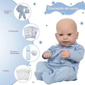 O kit acompanha 10 itens, incluindo um conjunto pagão azul, uma chupeta, uma mamadeira simples, cinco certificados e duas fraldas. Com esses acessórios, a criança poderá cuidar do boneco como se fosse um bebê de verdade, estimulando a criatividade e a imaginação.