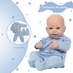Com aproximadamente 43cm de altura e peso de 0,700 Kg, o Boneco Bebê Reborn Luca é perfeito para crianças maiores de 03 anos. Ele acompanha um conjunto pagão azul e possui membros articulados, o que o torna ainda mais realista.